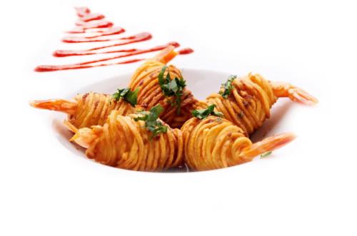 Krewetki w cieście ziemniaczanym z sosem tamaryndowcowo – kolendrowym